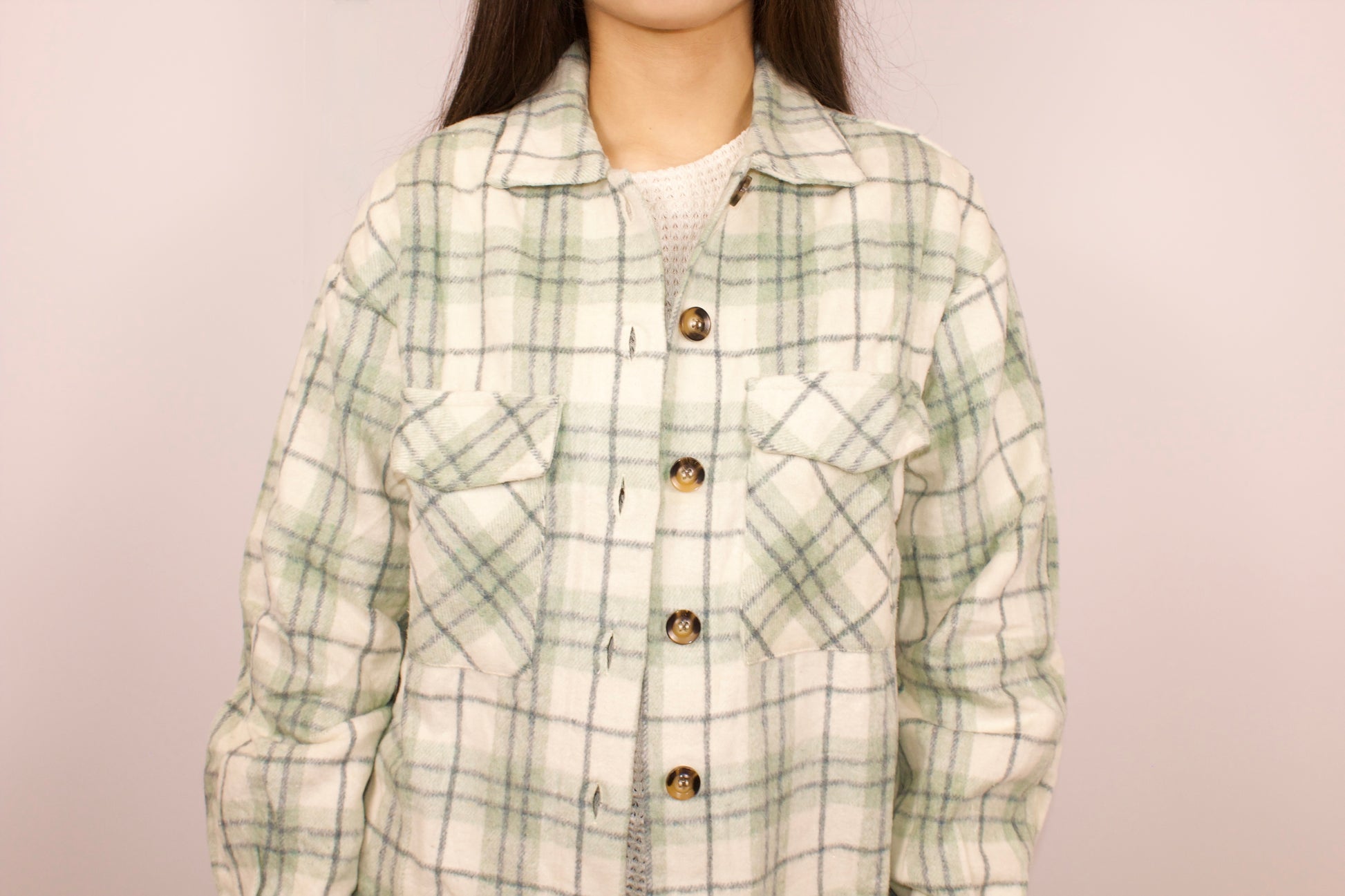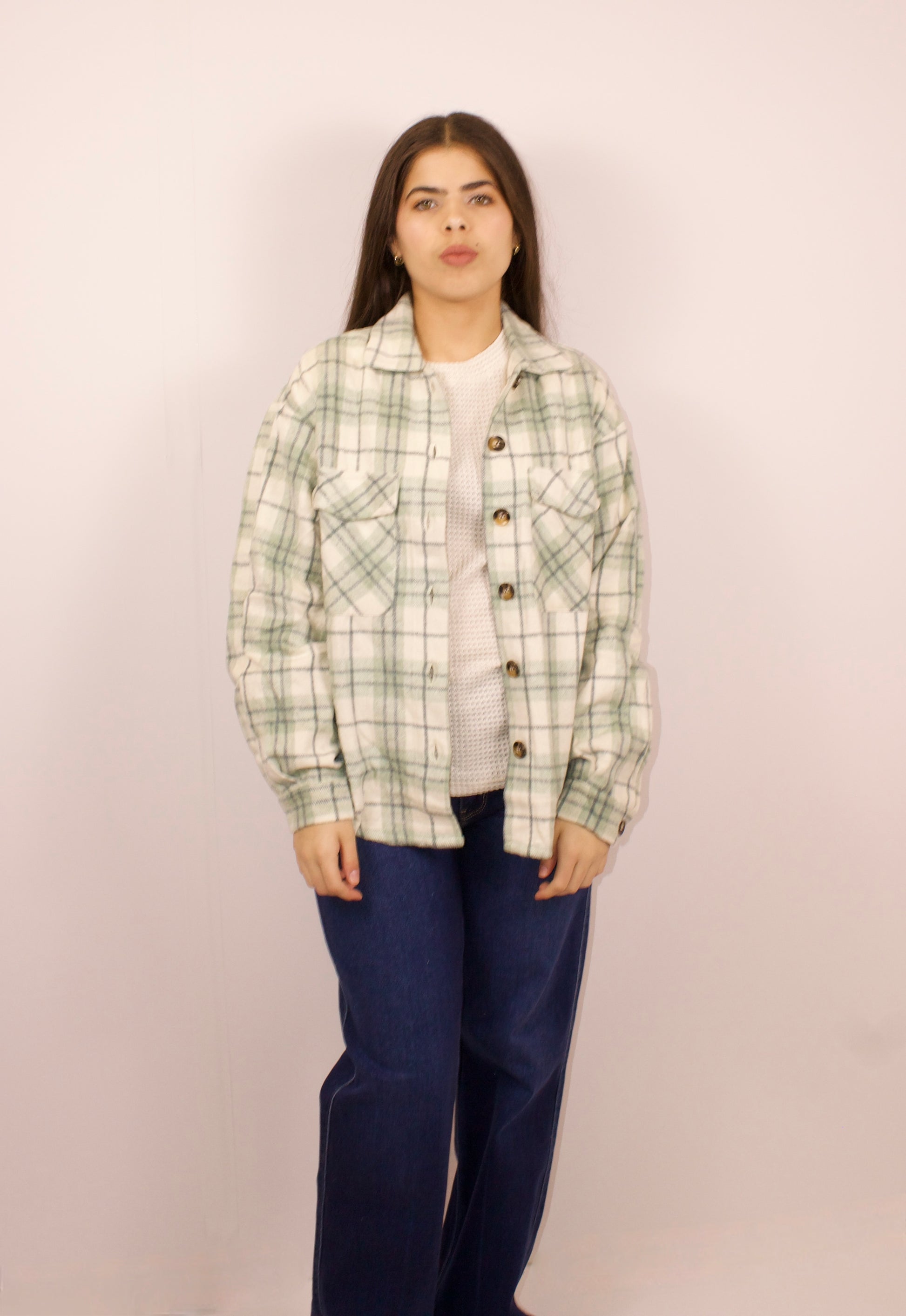 This sage green shacket combines the lightweight warmth of a jacket with the casual style of a shirt. It features subtle sage-colored lines and contrasting brown buttons for a refined look. Designed with practicality in mind, it includes pockets for added convenience, making it a versatile layering piece for cooler days.