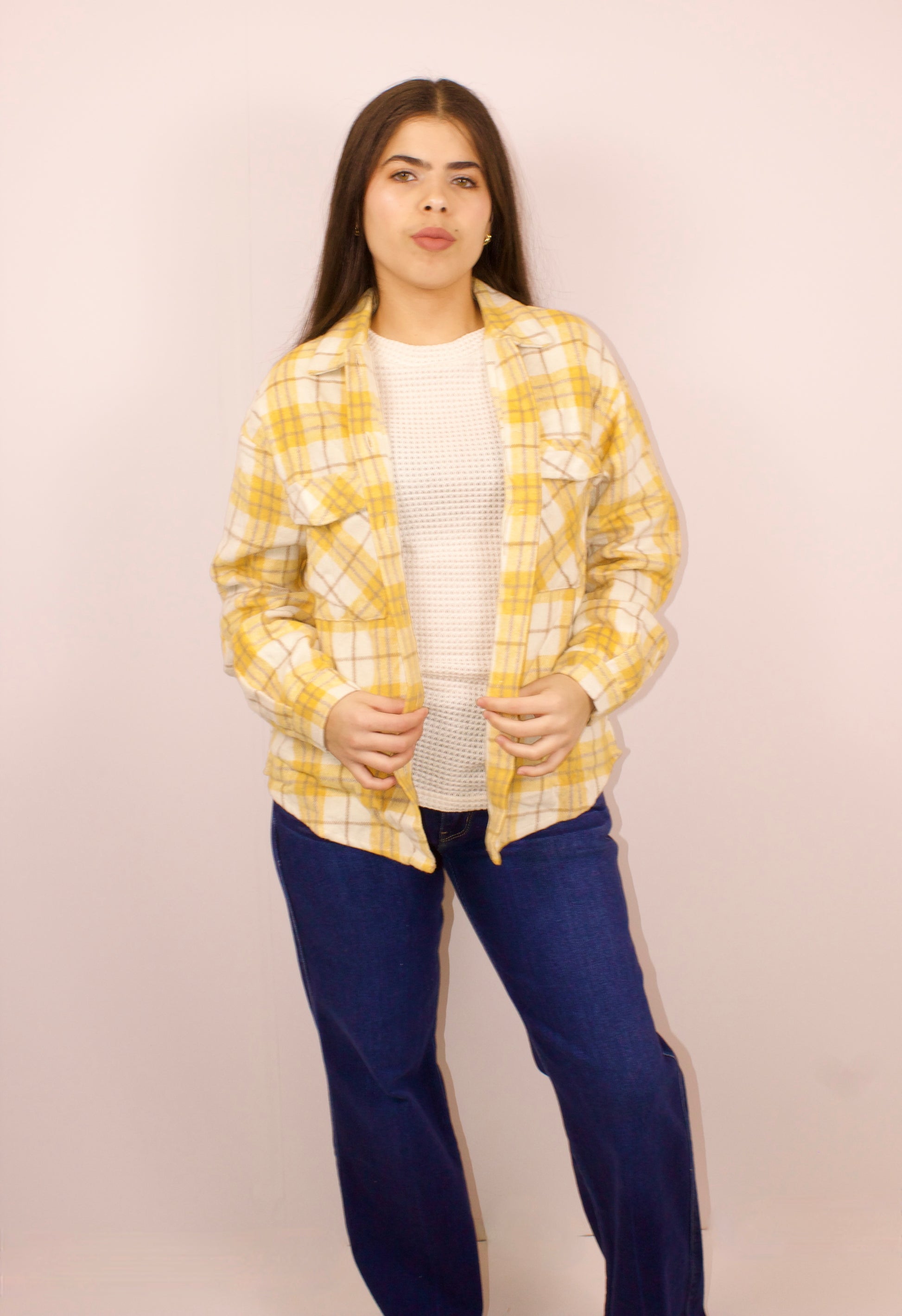 This yellow striped shacket combines style and comfort with its warm yet lightweight fabric, ideal for transitional weather. Featuring brown buttons that add a classic touch, it offers a cozy fit without bulk, making it a versatile layering piece for any wardrobe.