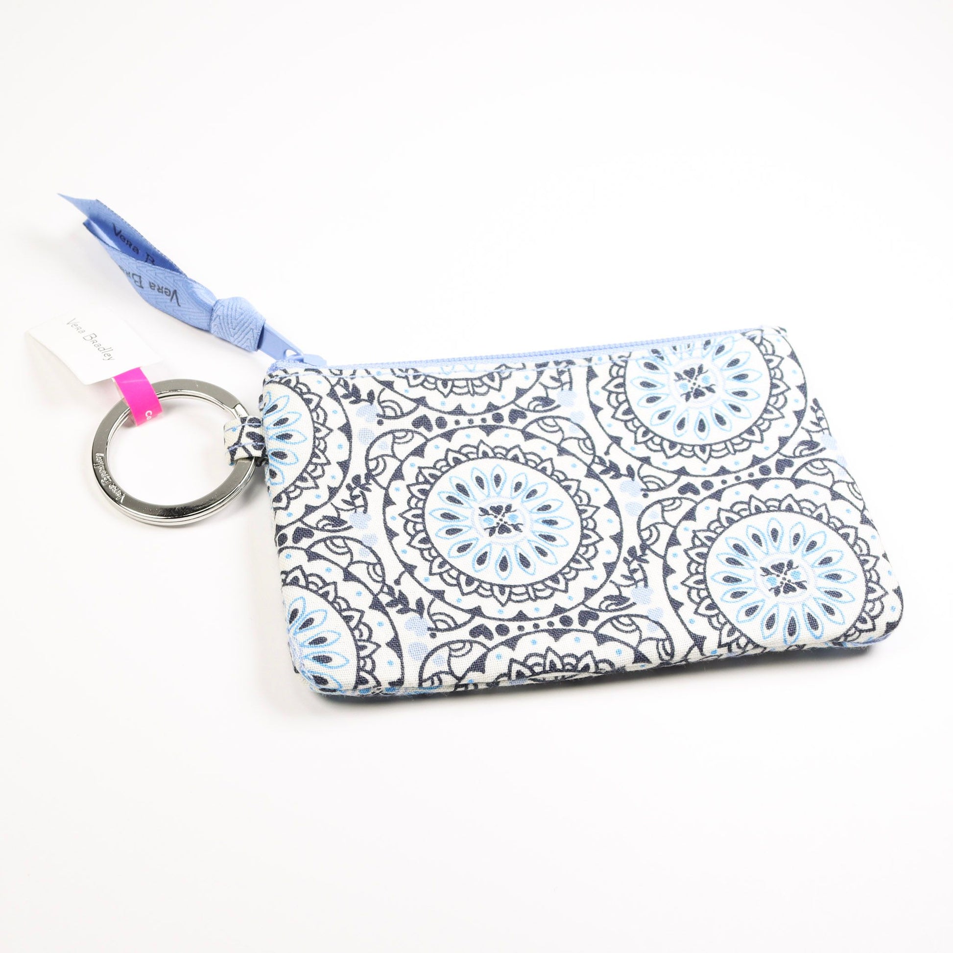 This Vera Bradley zipper wallet in a variety of fun florals and prints offers organized convenience with a built-in key ring and a clear ID window, ensuring easy access and secure storage. Crafted for durability and everyday use, it combines practical features with a sleek design to keep essentials neatly arranged while complementing your style.